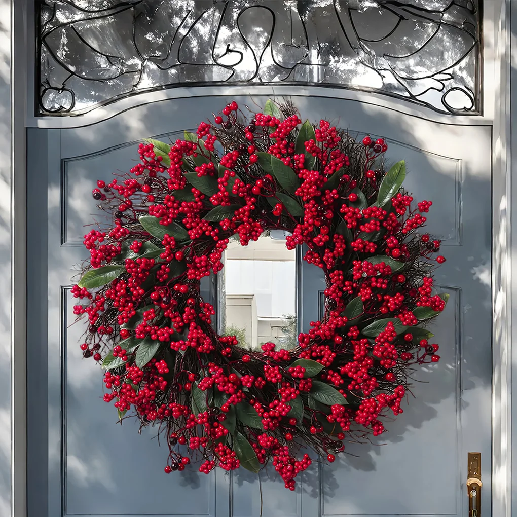 Com bagas vermelhas, folhagens sutis e acabamento artesanal, ela adiciona um toque sofisticado e acolhedor à porta de entrada, paredes ou lareiras — perfeita para dar boas-vindas com elegância durante a temporada de festas.